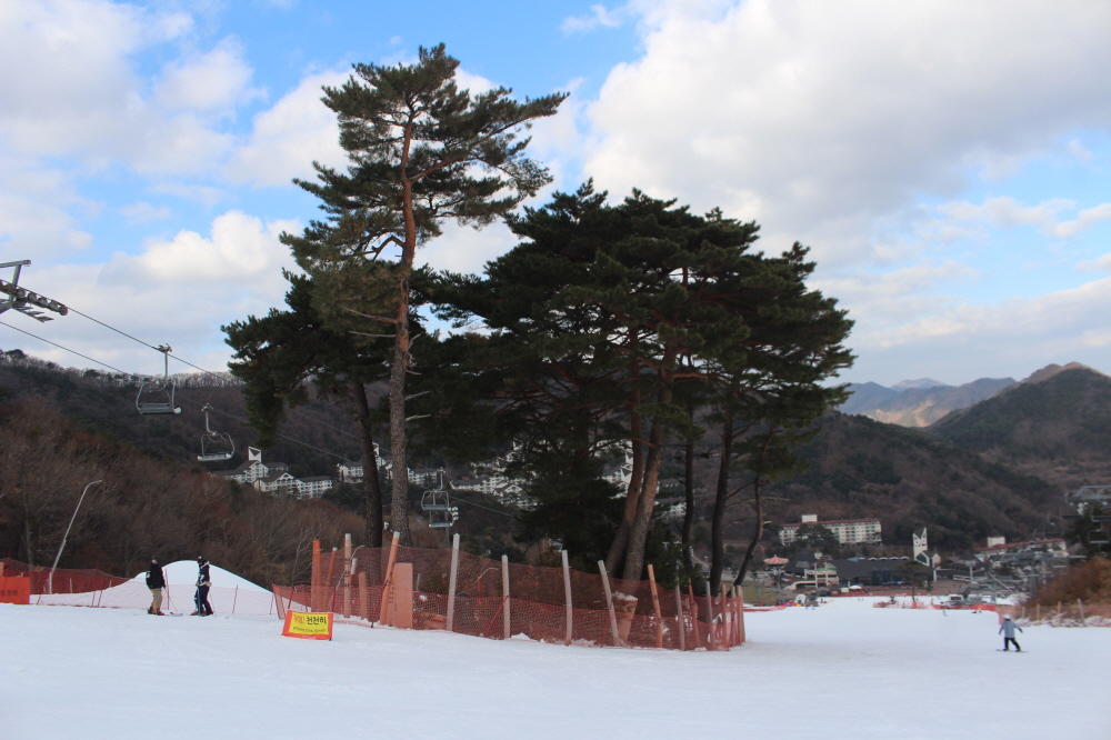 오늘 새롭게 문을 연 루키힐 슬로프입니다. 중간에 위치한 소나무를 조심하시길 바랍니다.