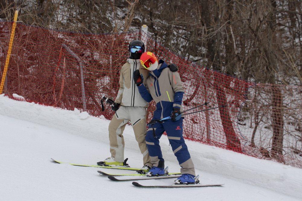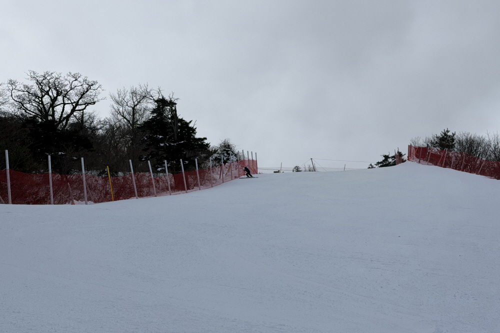 야마가 슬로프는 상단의 차가운 공기와 햇빛이 만나 설면이 은은하게 반짝이며, 경사면 전체가 밝게 드러나는 풍경이었습니다.