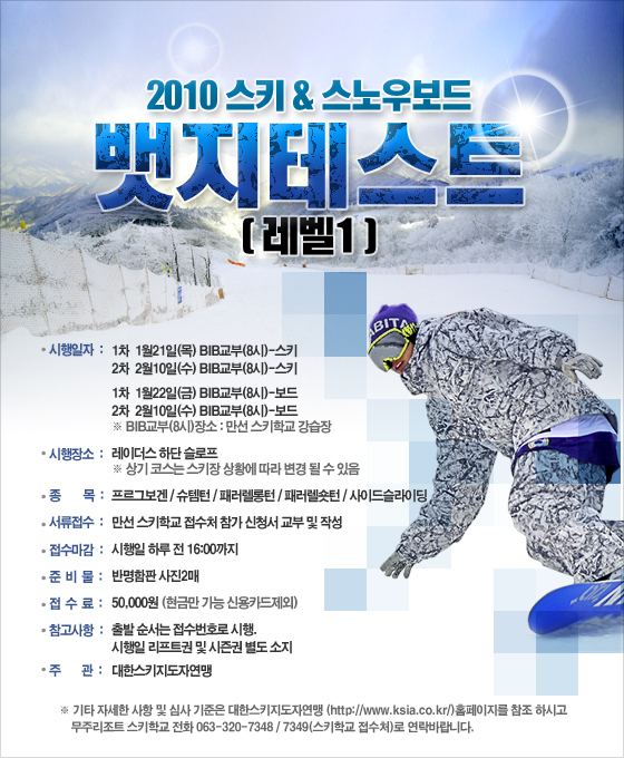 2010 스키 & 스노우보드 뱃지테스트( 레벨1 )2010-01-08 확인 다음글09/10 일일스키 설문조사 이벤트 1차 당첨자 발표! 이전글카니발 스트리트 Food Festival 목록