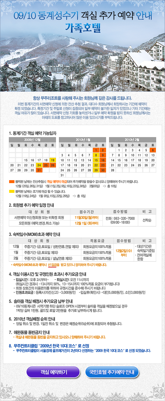 09/10 동계성수기 가족호텔 객실 추가 예약 안내2009-11-24 확인 다음글09/10 동계성수기 국민호텔 객실 추가 예약 안내 이전글09/10 스키어와 보더를 위한 시즌 보험 !!! 목록