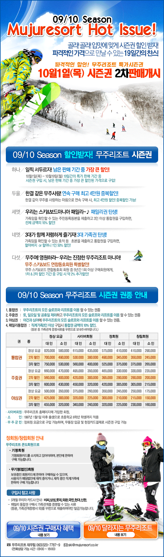 09/10 무주리조트 2차 시즌권 판매안내2009-09-30 확인 다음글따져보고 즐기자 ! Beautiful Muju ! 상상초월 ! 일석다조 ! 꽃보다 무주 패키지 이전글동계 가족/국민호텔 예약 안내 목록