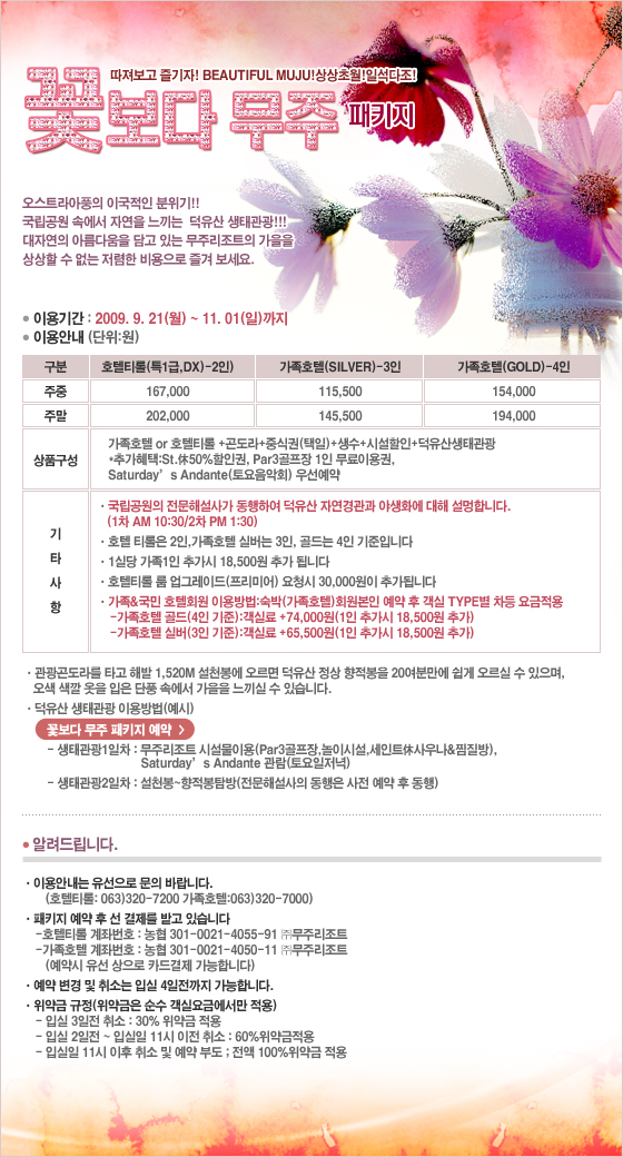 따져보고 즐기자 ! Beautiful Muju ! 상상초월 ! 일석다조 ! 꽃보다 무주 패키지2009-09-30 확인 다음글국내최고 아마추어 아티스트를 초대합니다. 이전글09/10 무주리조트 2차 시즌권 판매안내 목록