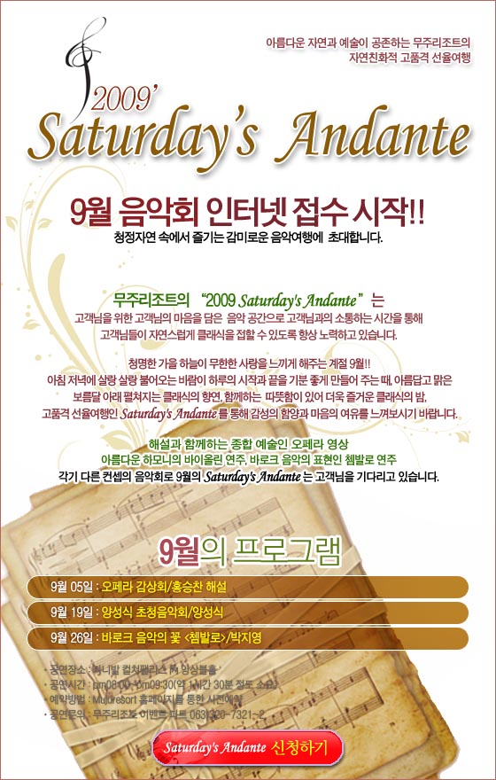 9월 Saturday's Andante에 고객님을 초대합니다.2009-08-10 확인 다음글09/10 무주리조트 시즌권 판매 안내! 이전글세인트 休 클럽 사우나&찜질방 여름 이벤트! 목록
