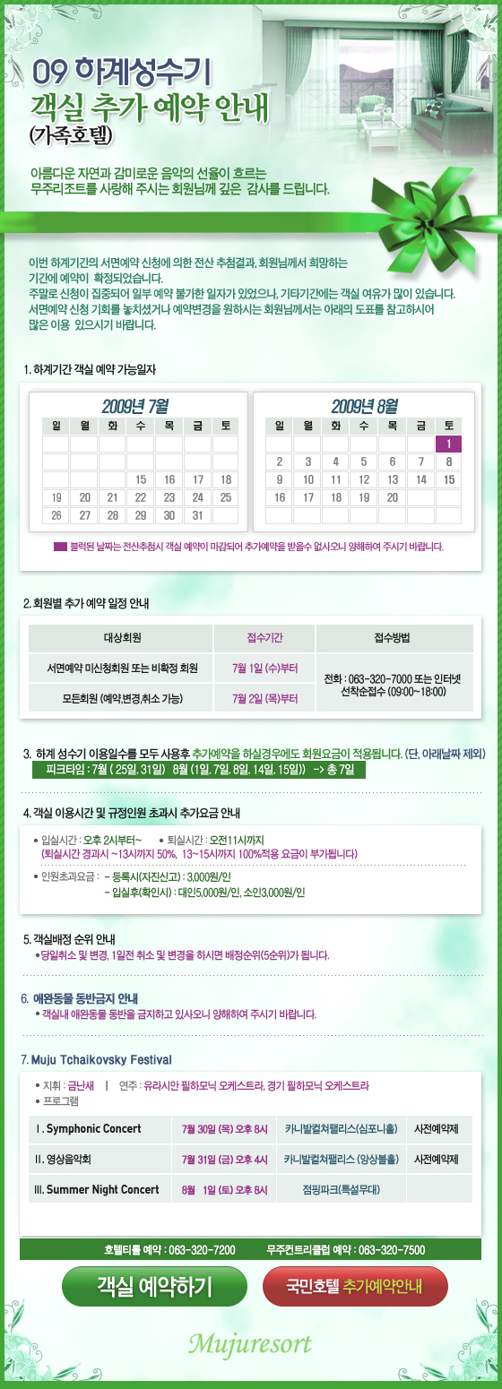 09 하계성수기 가족호텔 객실 추가예약 안내2009-06-24 확인 다음글09 하계성수기 국민호텔 객실 추가예약 안내 이전글세인트 休 사우나 & 찜질방! 기분좋게 저렴하게 이용 할 수 있는 방법 목록
