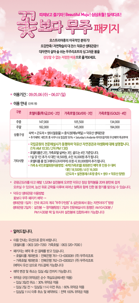 따져보고 즐기자 ! Beautiful Muju ! 상상초월 ! 일석다조 ! 꽃보다 무주 패키지2009-04-27 확인 다음글09년 무주구천동 철쭉제에 초대합니다 이전글관광 곤도라 이용요금 인상 안내 목록