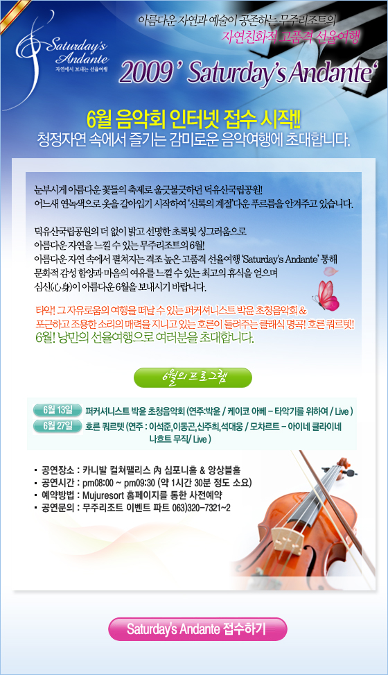 6월 Saturday's Andante에 고객님을 초대합니다.2009-05-18 확인 다음글광주 ↔ 무주리조트간 셔틀버스 운행 이전글2009년도 무주리조트 회원을 위한 무주컨트리클럽 골프라운드 신청 안내 목록