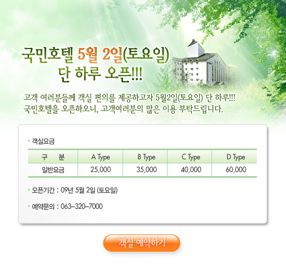 국민호텔 5월 2일(토요일) 단 하루 오픈!!!2009-04-09 확인 다음글무주리조트가 준비한 어린이날 풍성한 가족 이벤트 이전글5월 Saturday`s Andante에 고객님을 초대합니다. 목록