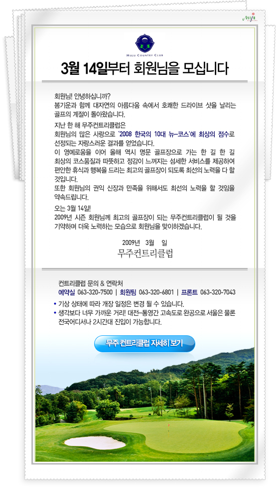 무주컨트리클럽 3월 14일부터 회원님을 모십니다.2009-03-04 확인 다음글3월 14일! 인도 전통 문화와 예술 공연에 고객여러분을 초대합니다! 이전글3월 5일(목) ~ 멜로디리프트 운행 START! 목록