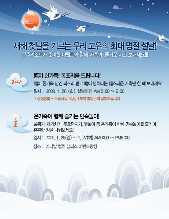 무주리조트가 준비한 설날 이벤트!2009-01-23 확인 다음글국내 유일! 4대 명산 덕유산 국립공원의 아름다운 설경을 감상할 수 있는 대자연의 스키장! 이전글무주제왕전 이벤트 2회차 당첨자 발표 목록