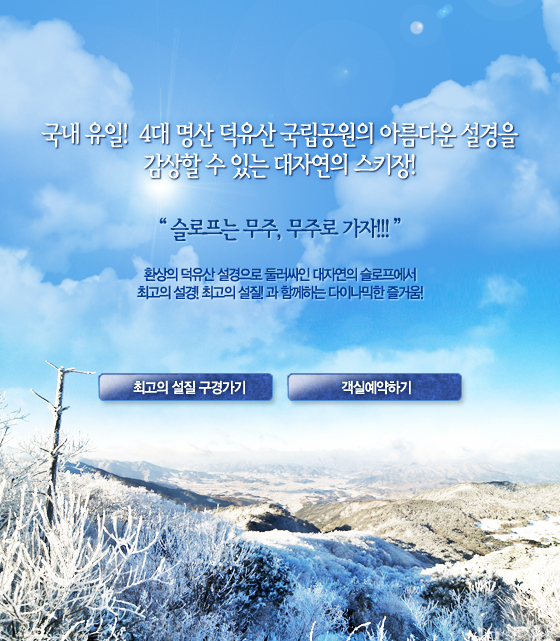 국내 유일! 4대 명산 덕유산 국립공원의 아름다운 설경을 감상할 수 있는 대자연의 스키장!2009-01-23 확인 다음글두근두근 사랑의 전광판 프로포즈 이벤트 vol.3 이전글무주리조트가 준비한 설날 이벤트! 목록