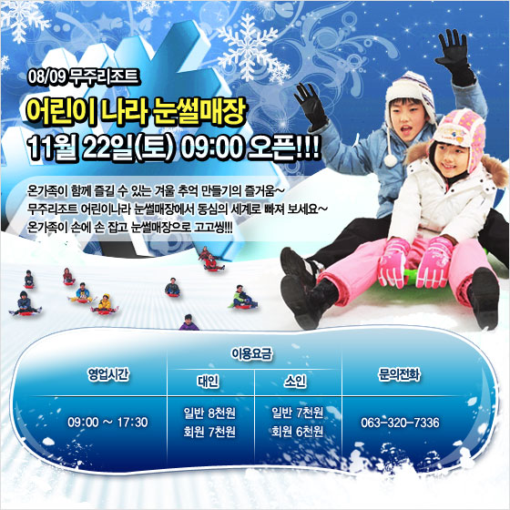 어린이나라 눈썰매장 11월 22일(토) 09:00 오픈!!!2008-11-24 확인 다음글11월 22일(토) 하루! 야간스키개장! 이전글★11월19일 ~ 11월20일 제설현황★ 목록