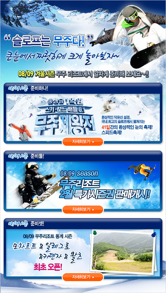 08/09 겨울시즌 무주 리조트에서 알차게 준비해 보세요~!!2008-09-26 확인 다음글세금감면에 따른 골프장 이용료 변경안내 이전글08/09 무주리조트 시즌권 1차 판매 안내 목록