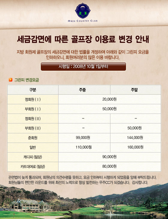 세금감면에 따른 골프장 이용료 변경안내2008-09-30 확인 다음글"향적봉 아고산대 야생화를 찾아서...!" 이전글08/09 겨울시즌 무주 리조트에서 알차게 준비해 보세요~!! 목록