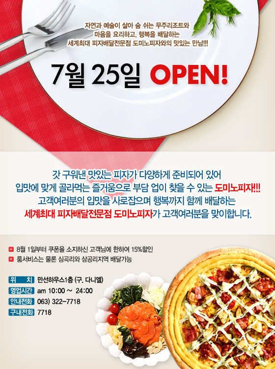 세계최대 피자배달전문점 도미노피자와의 맛있는 만남!!!2008-07-25 확인 다음글Saturday''s Andante 8월 2일 음악회 프로그램 변경 이전글[08/09 무주리조트 동계 시즌] 모차르트 & 알레그로 & 카덴자 & 왈츠 최초 오픈 목록
