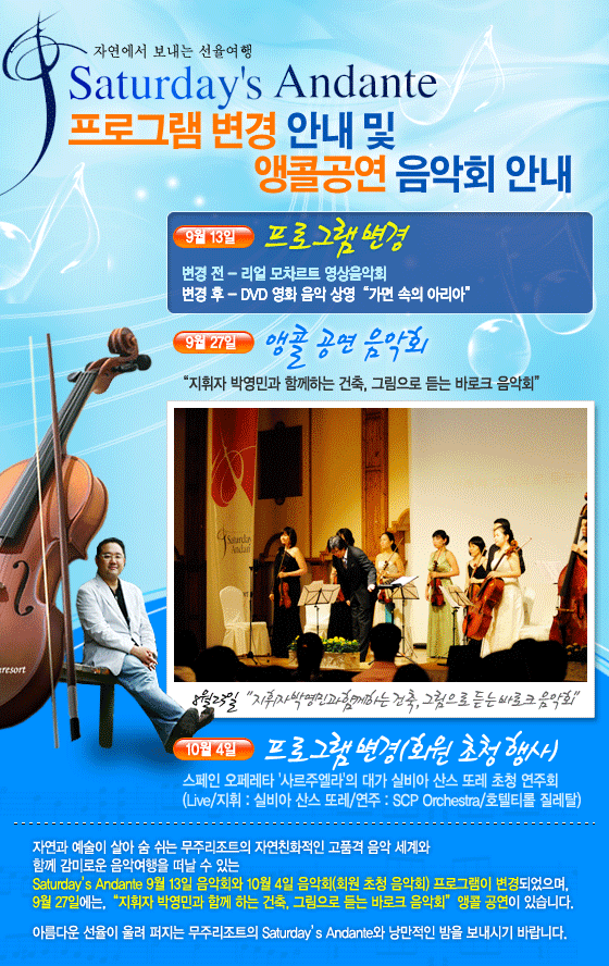 Saturday's Andante 프로그램 변경 안내 및 앵콜공연 음악회 안내2008-08-19 확인 다음글무주리조트 대대적 신규투자 본격화 ‘카니발 컬처 팰리스'' 오는 11월 완공 이전글관광 곤도라 추계 정기점검 안내 목록