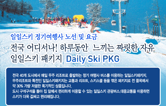 일일스키 정기여행사 노선 및 요금2005-12-07 구분 PKG 1 PKG 2 PKG 3 리프트+ 교통 리프트+ 교통 + 스키렌탈 리프트+ 교통 + 보드렌탈 리프트+ 교 통 + 렌탈+ 스키강습1:25 (바닥) 리프트+ 교 통 + 렌탈 + 보드강습 1:12 (바닥) 수 도 권 서울 어른 주간 27,000 35,000 35,000 40,000 47,000 어린이 주간 18,000 26,000 26,000 31,000 38,000 경 상 권 부산 어른 주간 48,000 56,000 56,000 61,000 확인 다음글KTX를 타고오셨다구요? 새벽버스를 놓치셨나요? 이전글눈꽃여행 패키지 목록